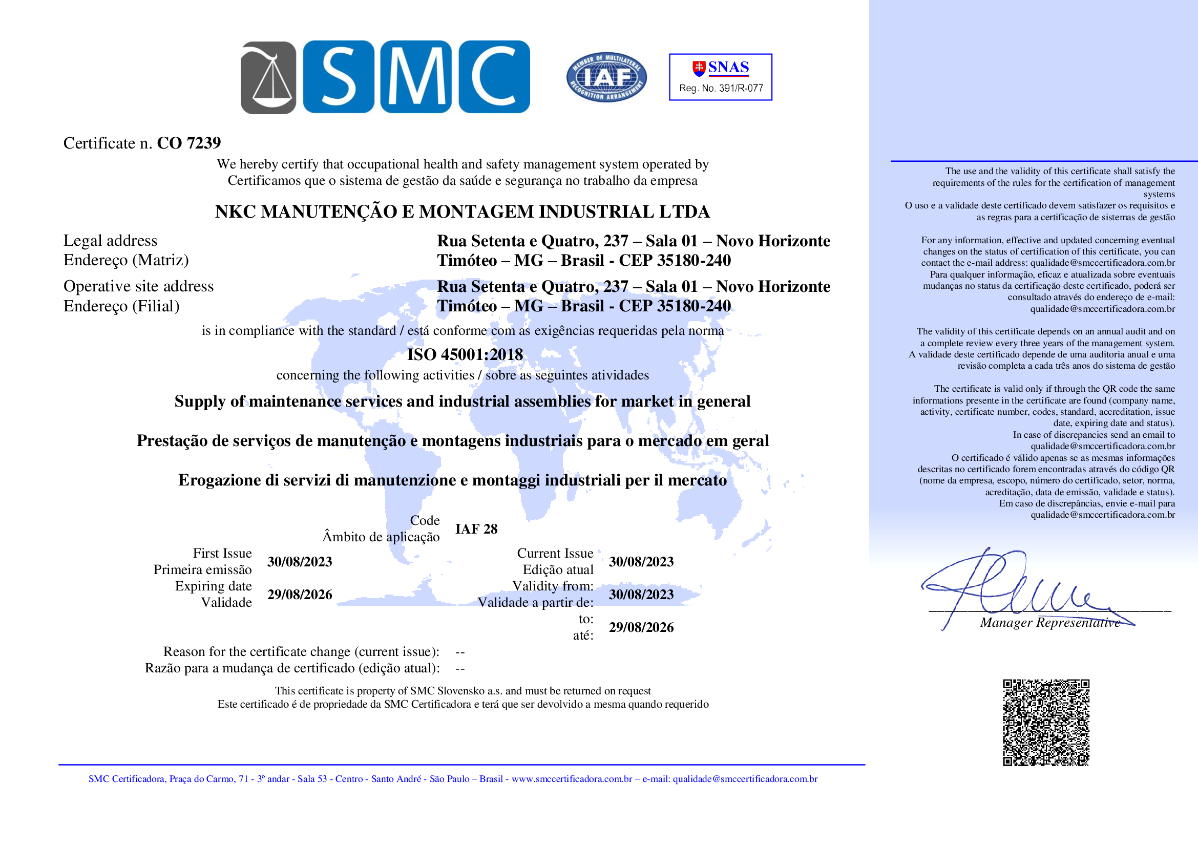NKC Manutenção e Montagem Industrial LTDA: CNPJ 26.385.568/0001-61 – Rua 74, N 237 - Novo Horizonte, Timóteo/MG CEP: 35180-240 – 2023.